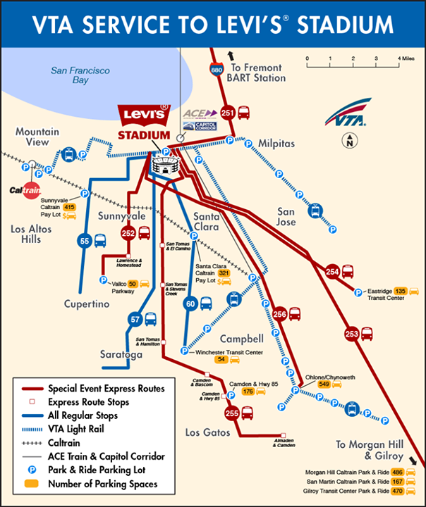 After hosting Super Bowl 50 ten years ago, Levi's Stadium in Santa Clara will once again host the big game. The stadium is located in close proximity to Silicon Valley hotels, restaurants, and visitor attractions. Public transit is also available via Valley Transportation Authority Light Rail (VTA).
